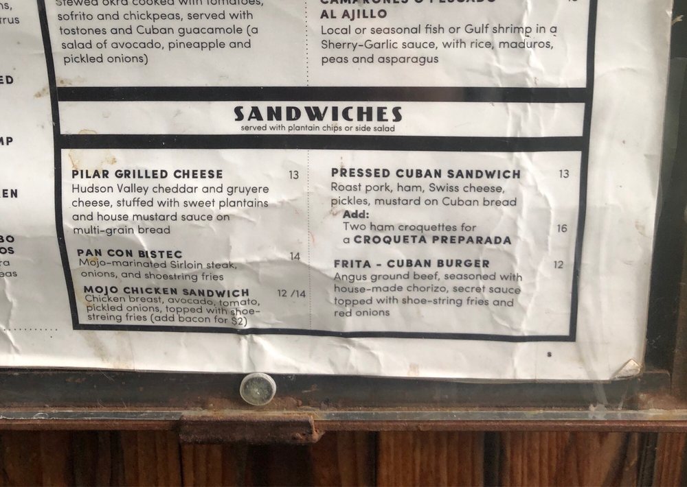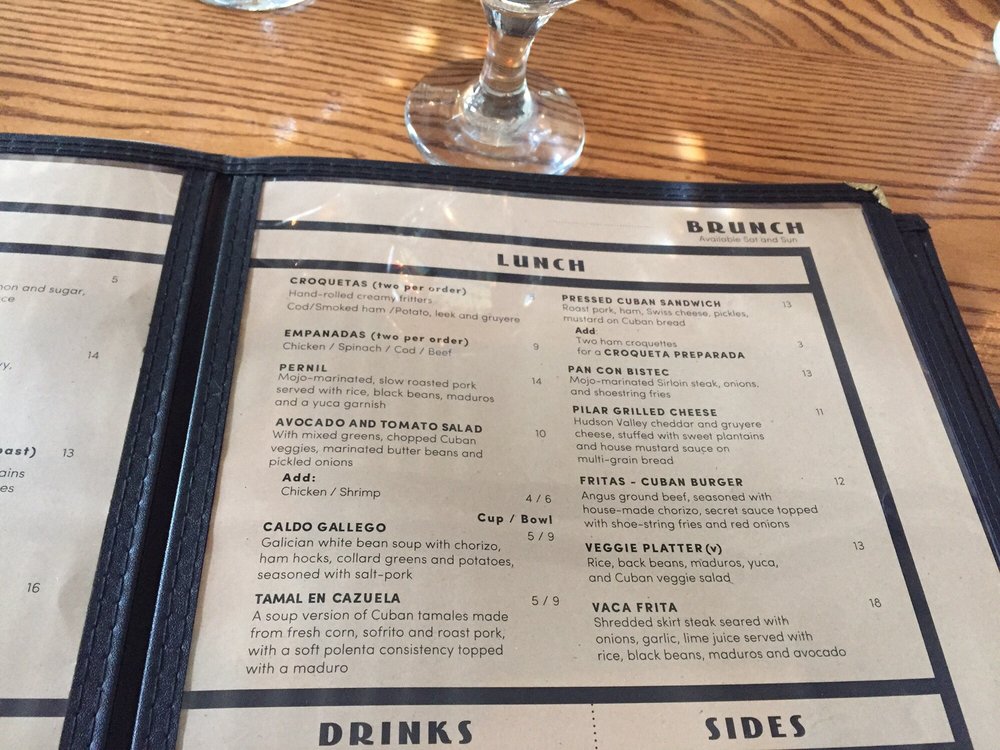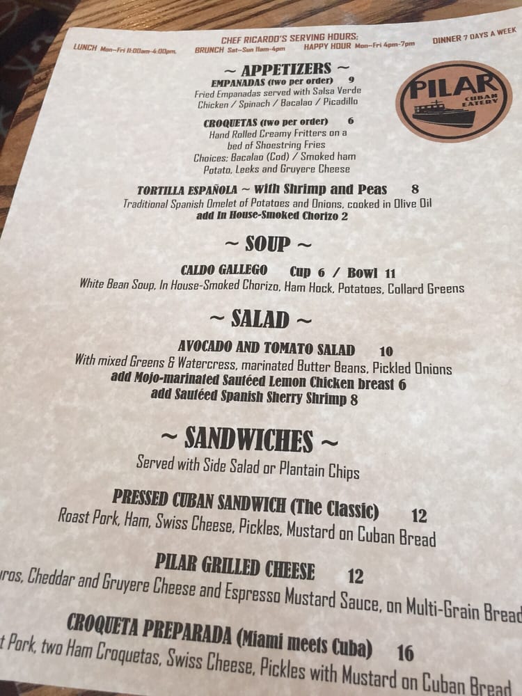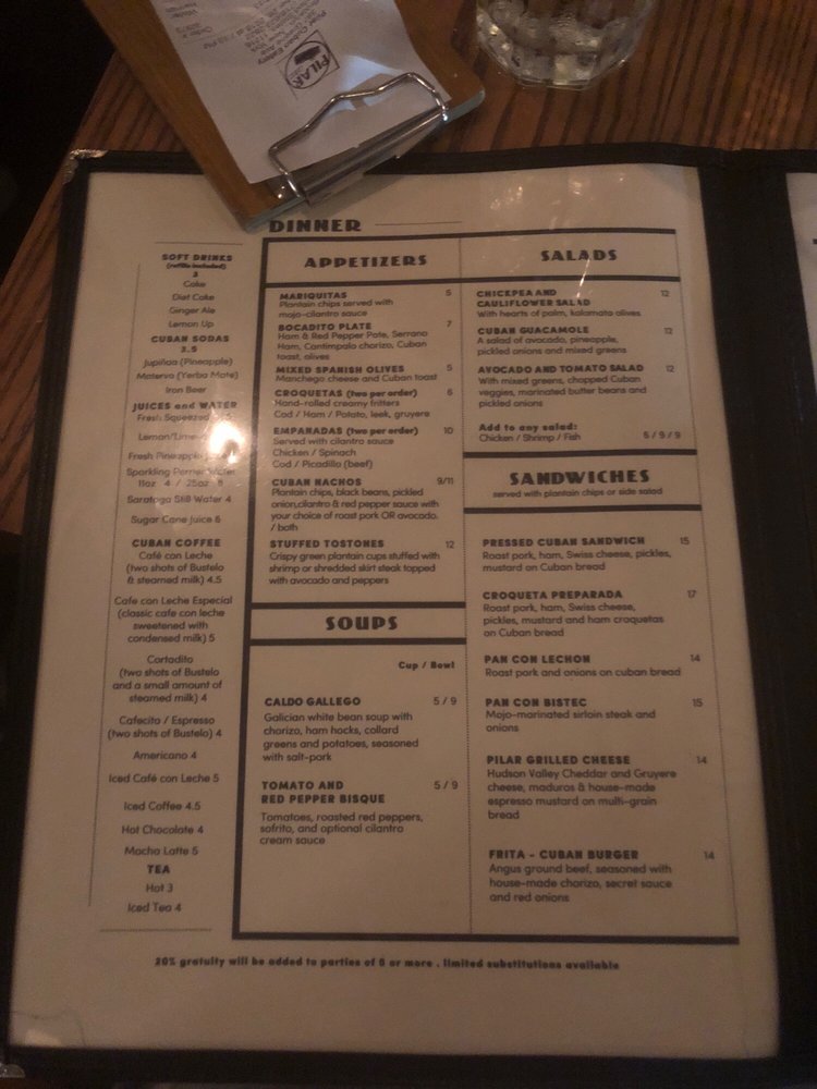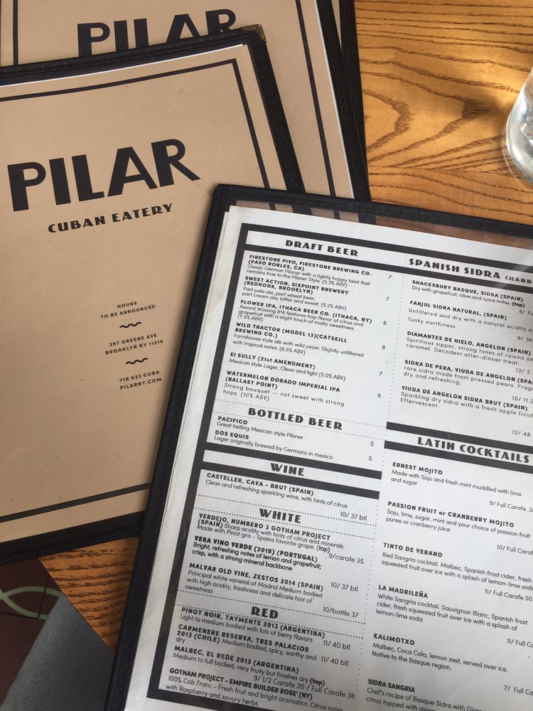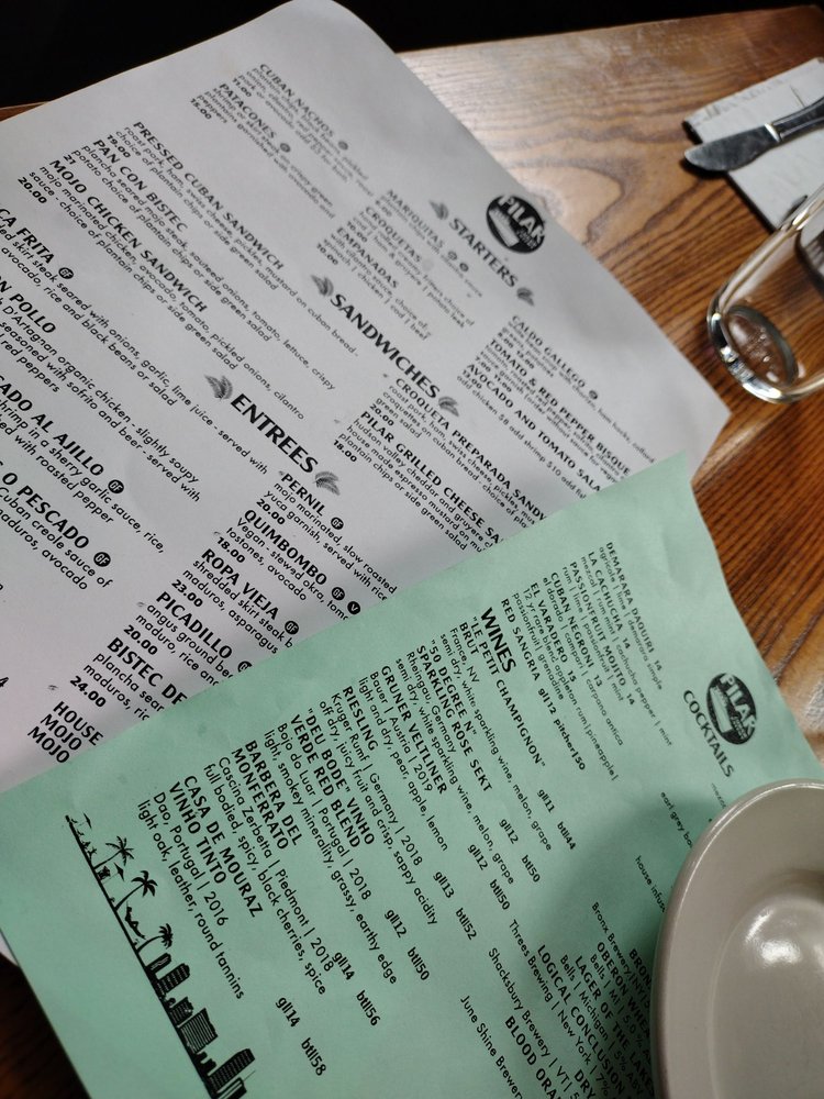 Introducing the menu at Pilar Cuban Eatery, located in Brooklyn, NY, a trendy and casual spot offering Cuban cuisine. With a menu that includes vegan options, happy hour specials, and a variety of options for brunch, lunch, and dinner, Pilar is a versatile eatery. Customers rave about the flavorful dishes, such as the guava and cheese pastry, Cuban grilled cheese, and the vegan platter. The space is described as cute and the service as fast and attentive, making it a great spot for a casual meal or even a first date. The outdoor seating and intimate vibe add to the overall experience. With a mix of traditional Cuban dishes and unique offerings like plantain chips and leek potato croquettes, Pilar Cuban Eatery is a must-visit for those looking for tasty and satisfying meals in a welcoming atmosphere.